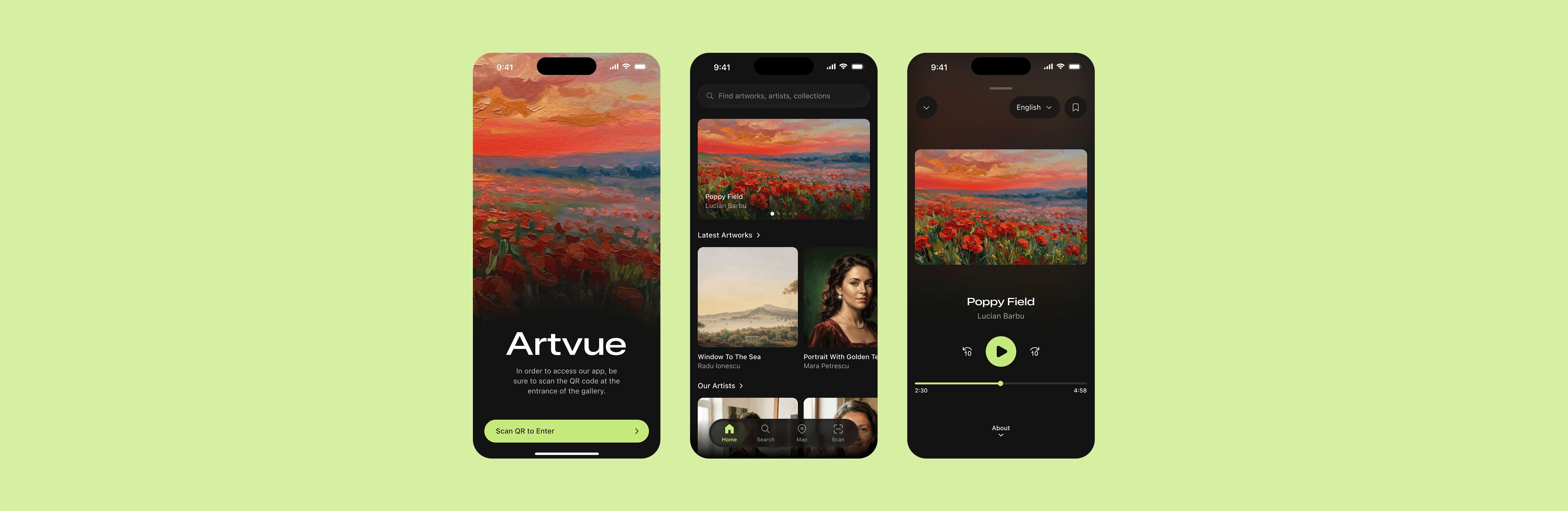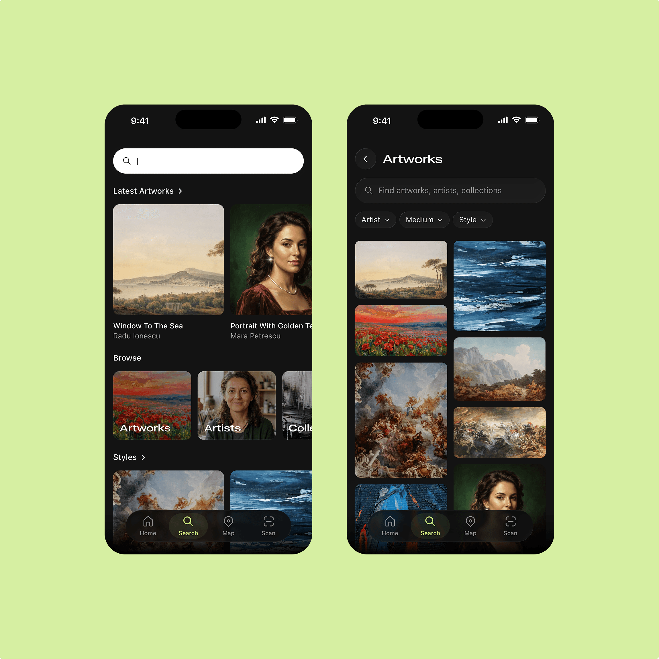 Wall placards are set in small type, mounted at awkward heights, and positioned so a few people reading them block the entire piece. In crowded galleries, you either crane over someone's shoulder or skip the context entirely. Our solution was a scan functionality that lets users point their camera at any artwork from whatever distance. The system automatically detects which piece they're looking at and takes them directly to the detail page. No hunting through menus, no matching numbers to labels.