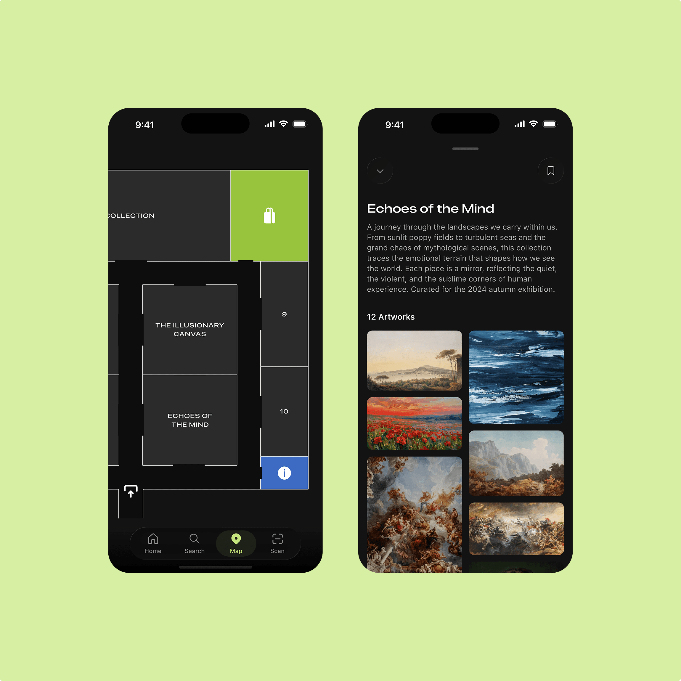Visitors often feel lost in galleries, unsure where to start or how to find specific pieces they came to see. Our solution was an interactive map showing the full gallery layout with every artwork marked. Users can tap on any piece to see its location, making it easy to find exactly what they're looking for.