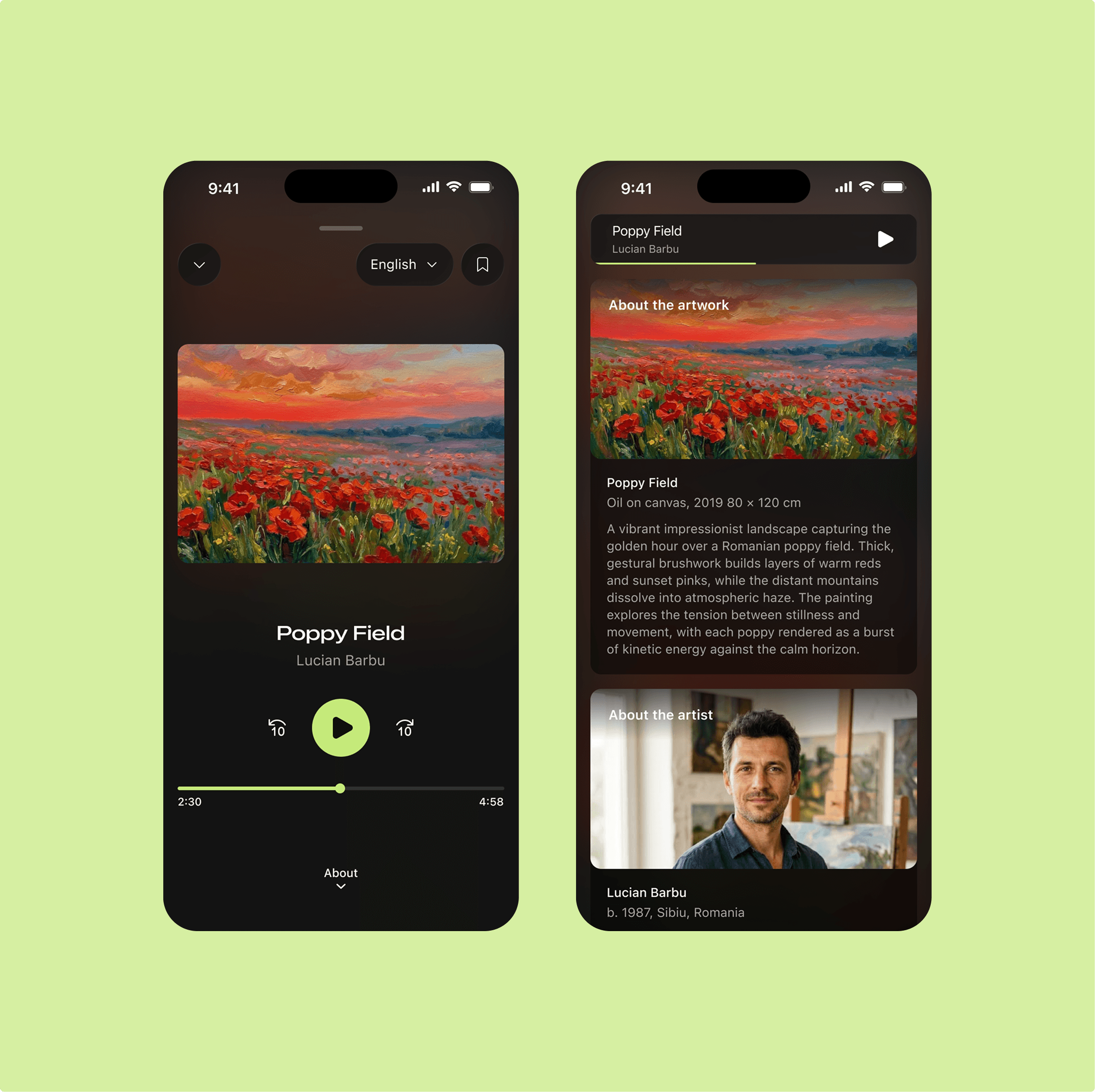 Art galleries can be intimidating, without context contemporary art often feels hard to understand. Our solution was that each artwork in Artvue has a dedicated page with both audio and text descriptions. Visitors can play the audio while taking in the piece at their own pace, or read through the details if they prefer. The pages also include information about the artist, the style, the historical context, and connections to other works in the exhibition.