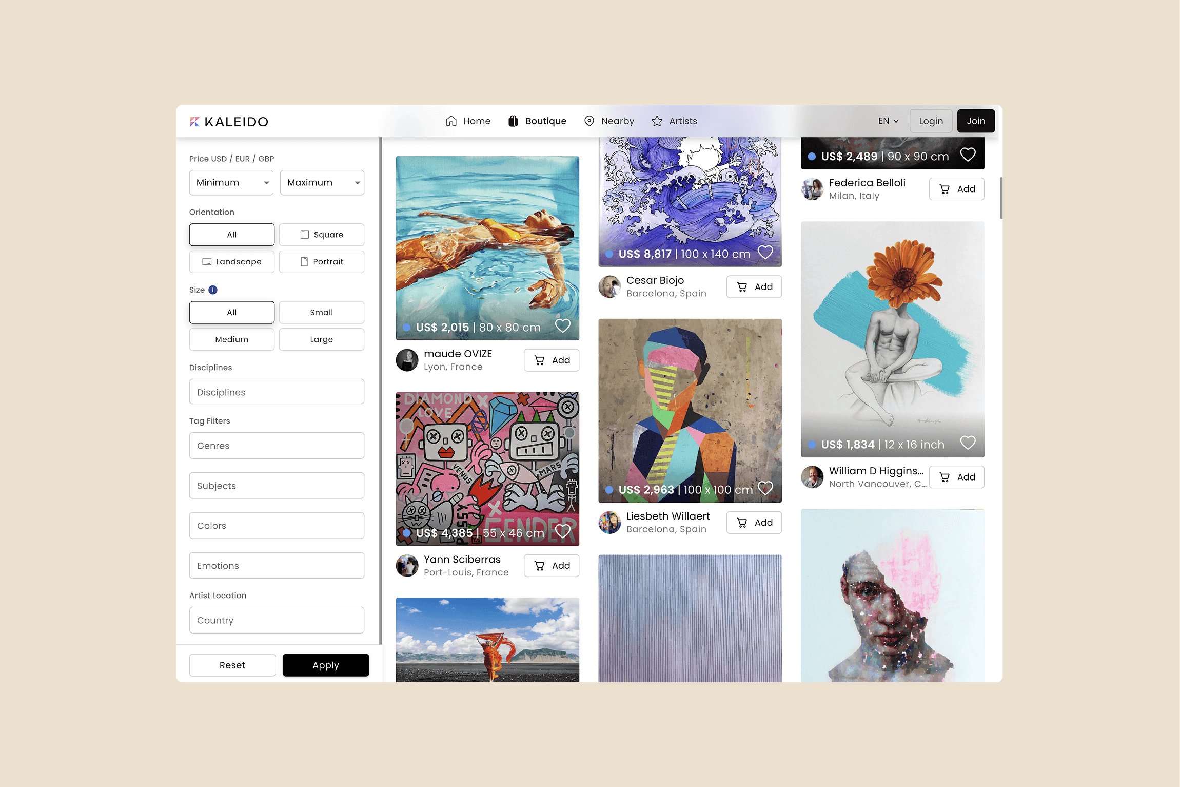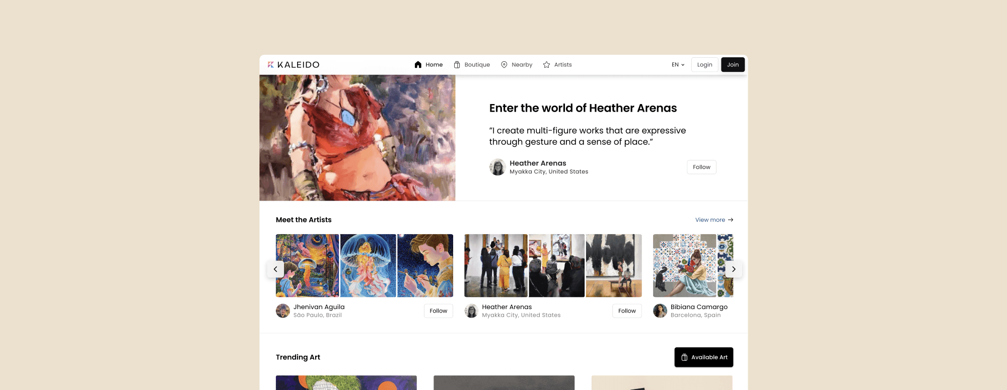Most online art platforms treat artwork like any other product listing: a flat image, a title, dimensions, a price. But buying art isn't like buying shoes. People need to feel something. They need to understand the artist's intent, see how a piece would look in their space, and trust that what they're buying is authentic. Kaleido's marketplace was designed to feel like walking through a gallery, not scrolling through a storefront. The interface stays minimal so the art can breathe, while giving collectors intuitive paths to discover artists across 150 countries.