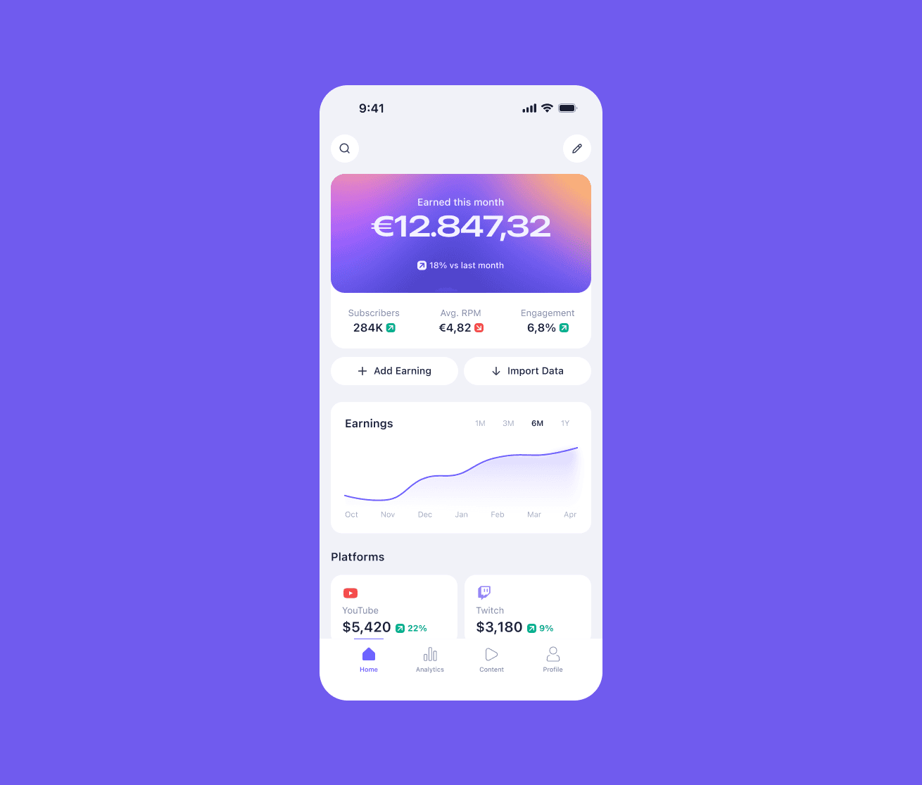 Creators earning across YouTube, Twitch, TikTok, Patreon, and other platforms have no single place to understand their total income. Each platform has its own analytics dashboard with different metrics and different levels of API access. YouTube is the only major platform that exposes full revenue data through its API, while Twitch doesn't share earnings at all, TikTok locks Creator Fund payouts inside the app, and Patreon only gives gross pledge amounts before fees. For creators treating content as a business, this fragmentation means missed tax obligations, poor forecasting, no way to identify which platform is most profitable, and no visibility into declining revenue until it's already happened.