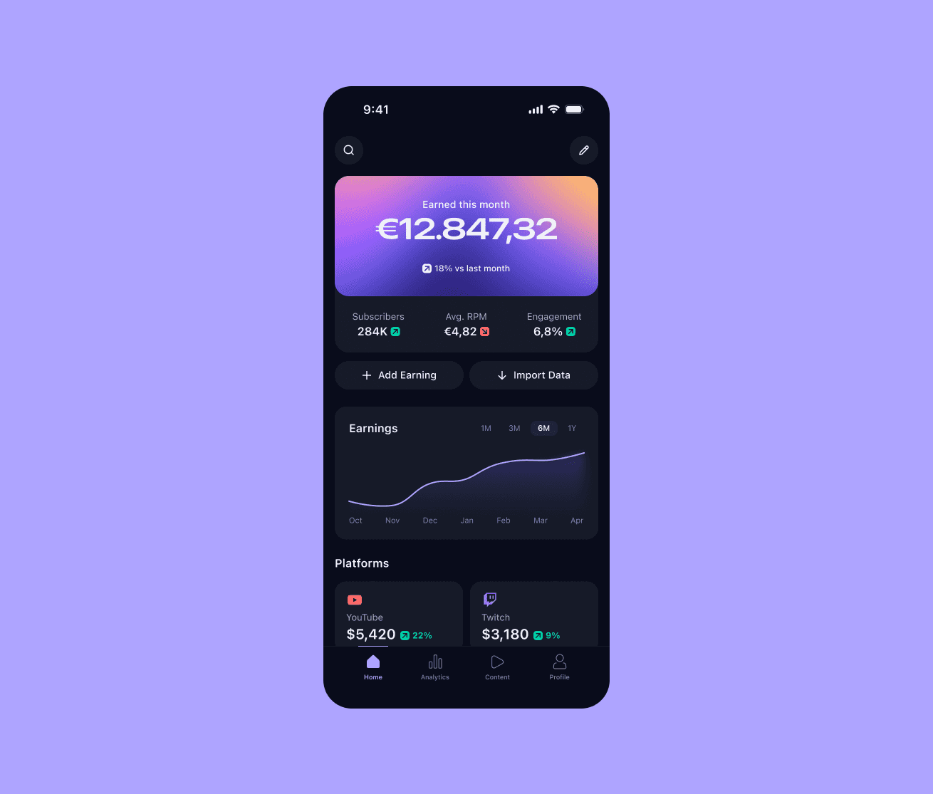 End to end product design for a mobile analytics dashboard that helps content creators track earnings, audience metrics, and content performance across multiple platforms in one place. The project involved API research, product scoping, interaction design, a full design system with OKLCH color ramps, high fidelity UI in both dark and light modes, and a dark themed mobile app with a complete light mode variant.